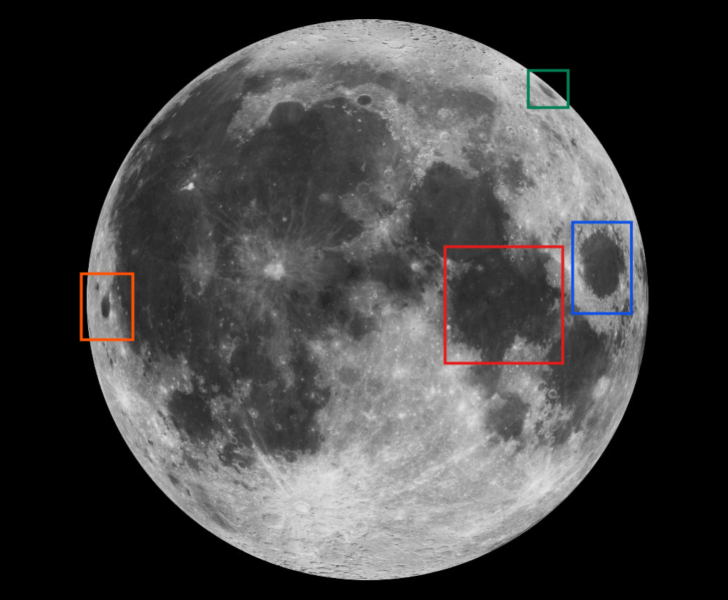 The maria provide helpful landmarks for understanding how the far side of the Moon was revealed, and I have highlighted a few helpful maria below. In red you can see the Sea of Tranquility, probably the most famous mare, since that’s where Apollo 11 landed. But the other ones I have marked will be the most helpful landmarks for this history. We will especially be tracking Grimaldi, really a crater on the western limb (edge) of the Moon with a mare floor. Over on the eastern limb, highlighted in green, is the Mare Humboldtianum. I’ve highlighted Mare Crisium in blue, since it is large and distinctive. But mainly keep your eye on Grimaldi and Humboldtianum.