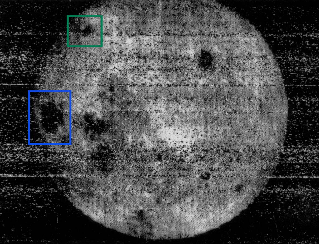 It is not the highest quality, but it is fairly amazing that it was possible at all in 1959, given the early state of the technology. Below, I’ve highlighted our landmark maria for reference–we’re seeing around the eastern limb. While distinct craters are hard to make out, we can easily see some new maria. The ones to the right and south of Mare Crisium are Mare Smythii and Mare Marignis (we had some glimpses of them on the western limb before Luna). But way out there on the right hand side of the image are two entirely new, entirely distinctive maria. The large one in the north was named Mare Moscoviense. The one in the south with the peak in the middle is the crater Tsiolkovskiy, named for the pioneering Russian rocket scientist.