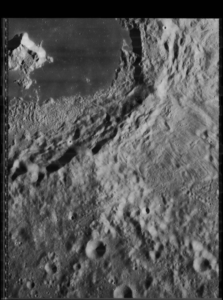 On Lunar Orbiter IV and V, scientists got the opportunity to play a more direct role in target selection. In the shot below from Lunar Orbiter IV, you can see Grimaldi, and down there near the edge, coming into full view: Mare Orientale. Just a few shot later…